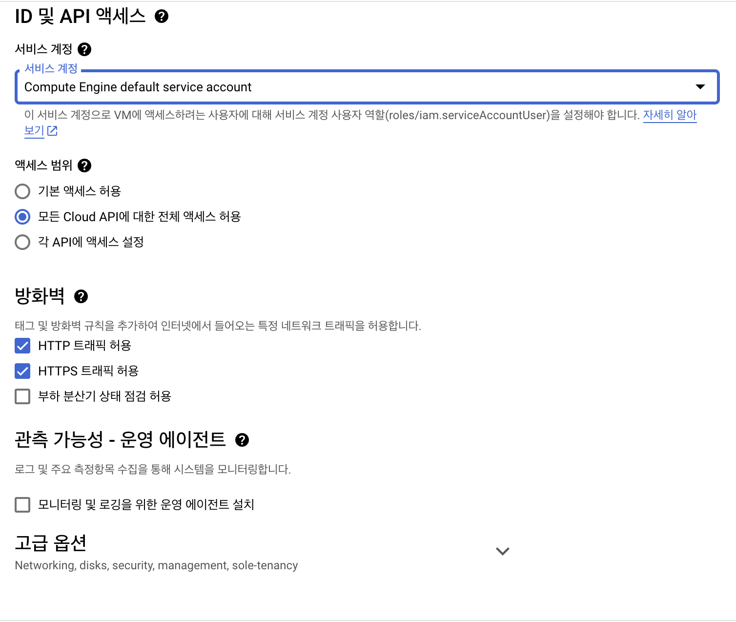 - 액세스 범위 - 모든 Cloud API에 대한 전체 엑세스 허용