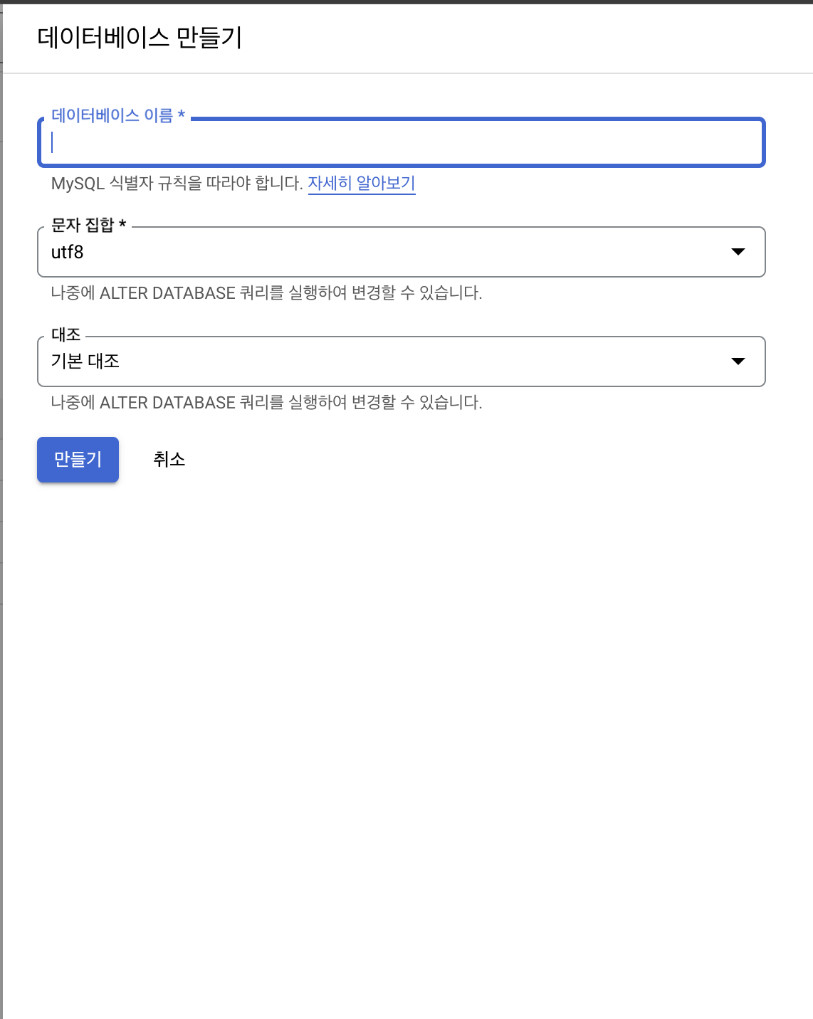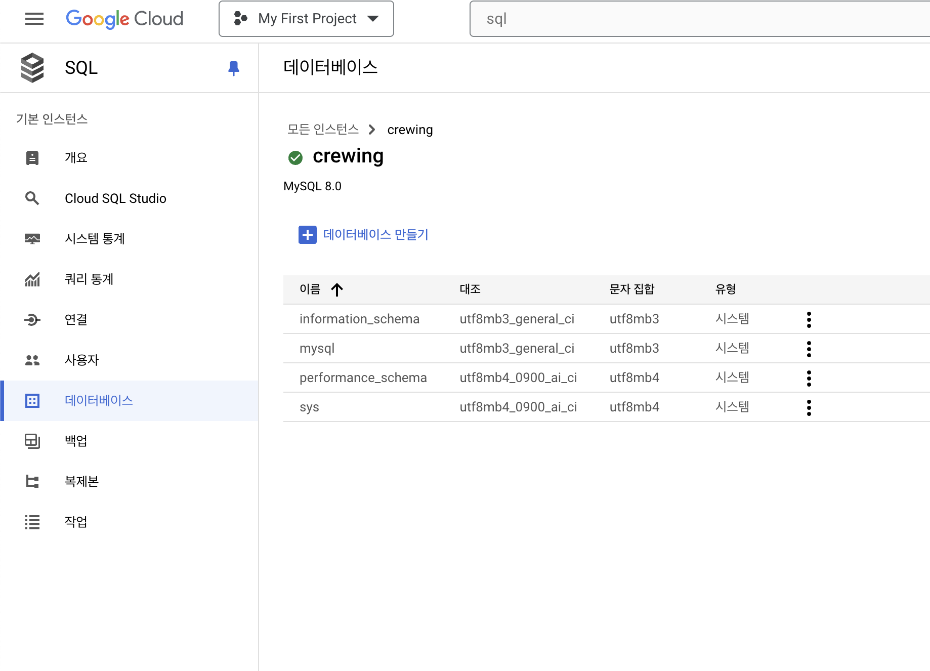 6. 좌측 메뉴에서 데이터베이스 탭 선택 후 데이터베이스 생성