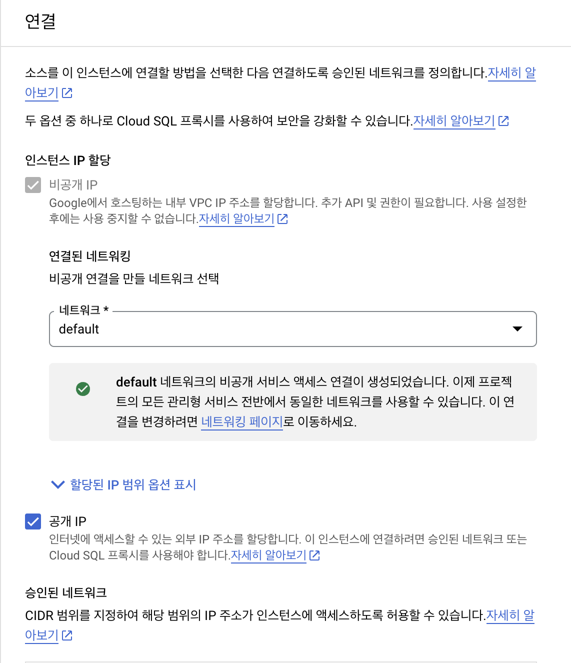 7. 생성 후 연결 탭에서 승인된 네트워크에 자신의 IP 주소 기입 및 비공개 IP 주소 활성화