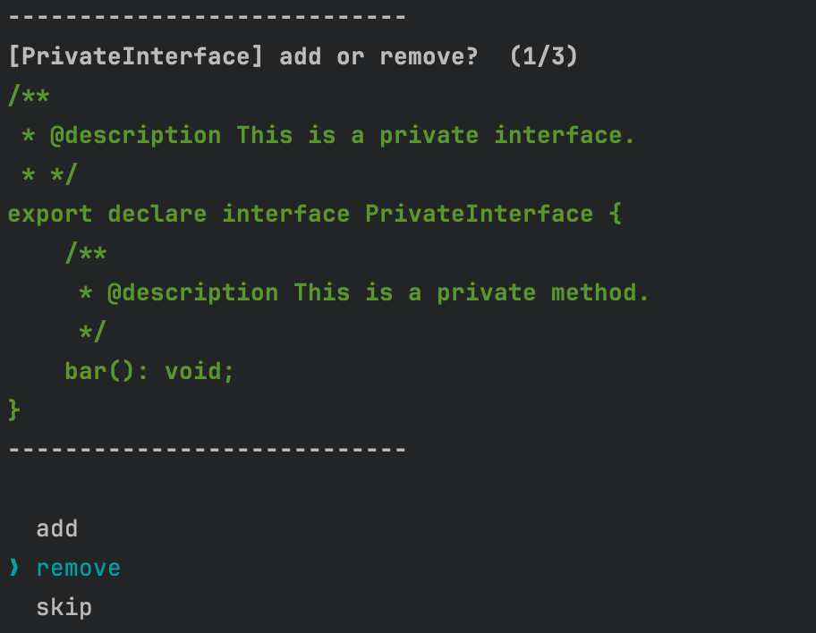 선택하면 알아서 기록이 되고, 이후 빌드부터는 해당 인터페이스는 별도의 주석 없이도 definition.d.ts 파일에서 퍼블릭 인터페이스가 아니라면 알아서 제거가 된다.