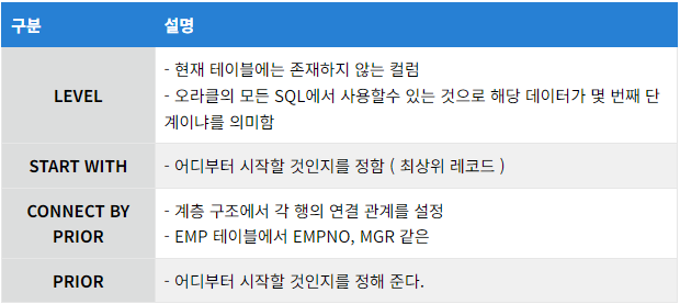 한테이블에 레코드들이 계층관계(상위,하위)를 이루며 존재할 때, 이 관계에 따라 레코드를 계층관계(상위,하위) 한 구조로 데이터를 가져올 때 사용되는 SQL문을 의미한다.
