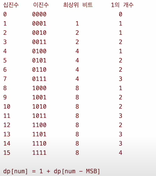 - 2진수로 반환 후 각 해당하는 값에 대해 1을 체크하여 ++를 해주었다.