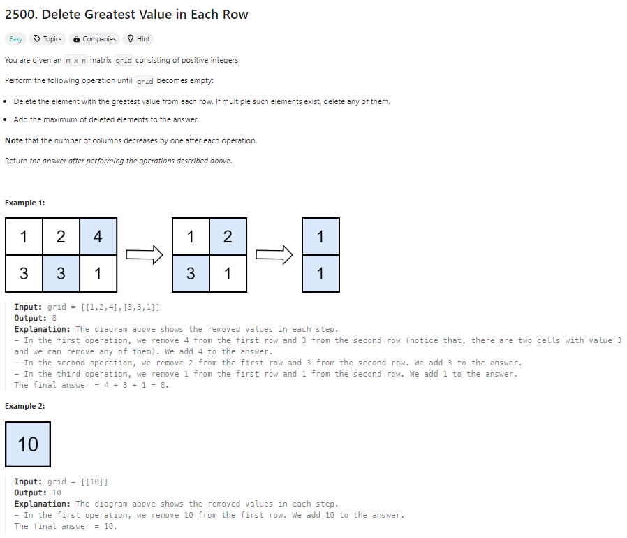 - 주어진 각 행에 대해 큰값부터 제거할때 행이 2개일땐 그 값중 큰값을 제거하며 그외에는 그냥 큰값을 그 값을 answer에 더해주는 문제이다.