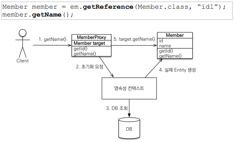 LazyInitailizationException발생가능하다.Member member = em.getReference(Member.class, "id1");