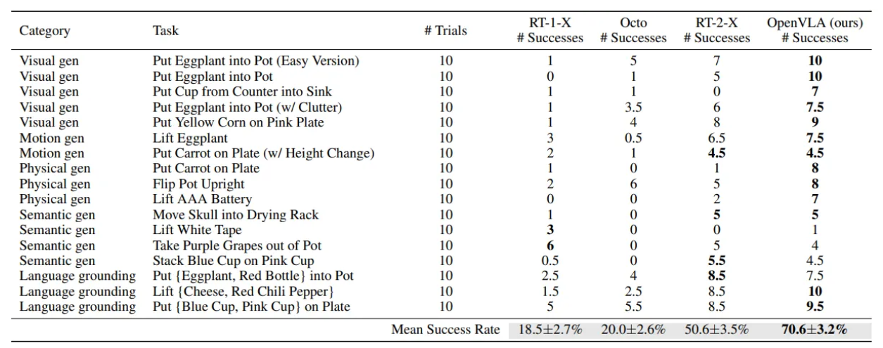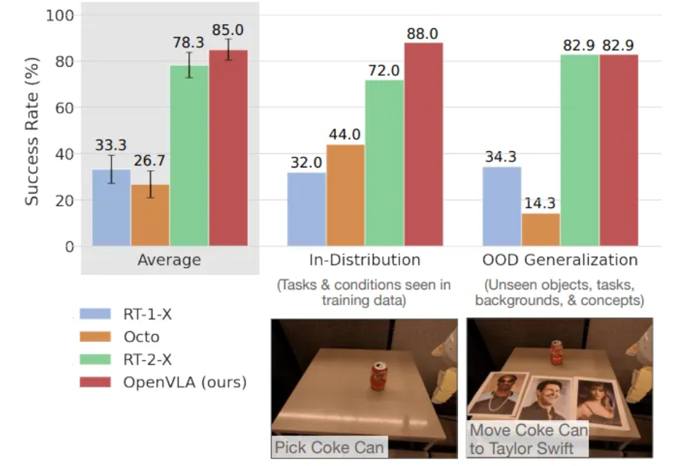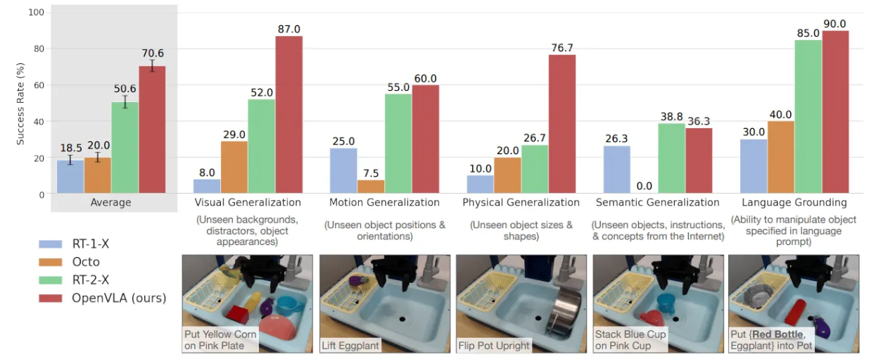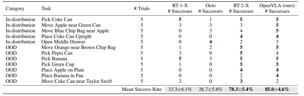 - OpenVLA와 RT-2-X가 RT-1-X 및 Octo에 비해 모든 작업에서 일관되게 높은 성공률을 보임