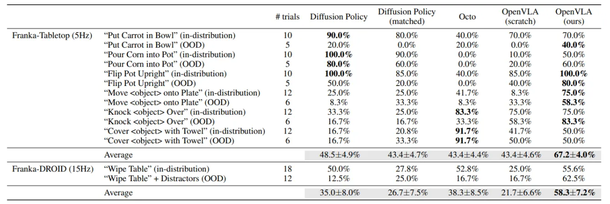 - Franka-Tabletop 및 Franka-DROID와 같은 새로운 로봇 설정에 OpenVLA를 적용했을 때의 주요 결과를 요약하여 보여줌