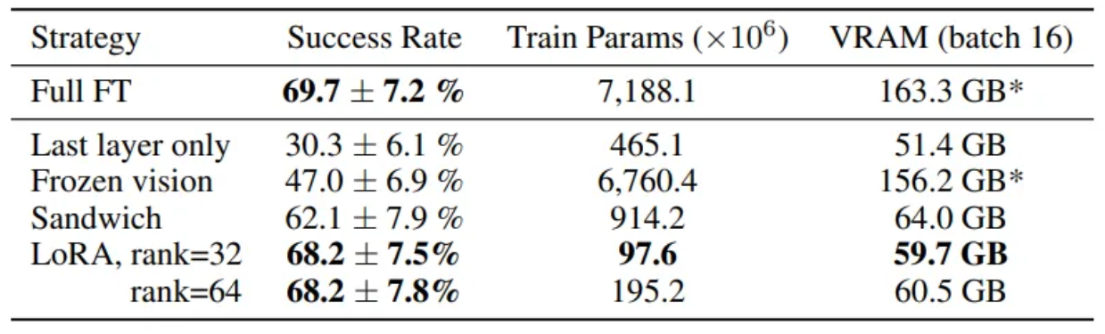 - VLM 사전 학습에서는 visual encoder를 고정하는 것이 일반적이지만, OpenVLA 학습에서는 isual encoder를 fine-tuning 하는 것이 VLA 성능에 결정적임을 발견