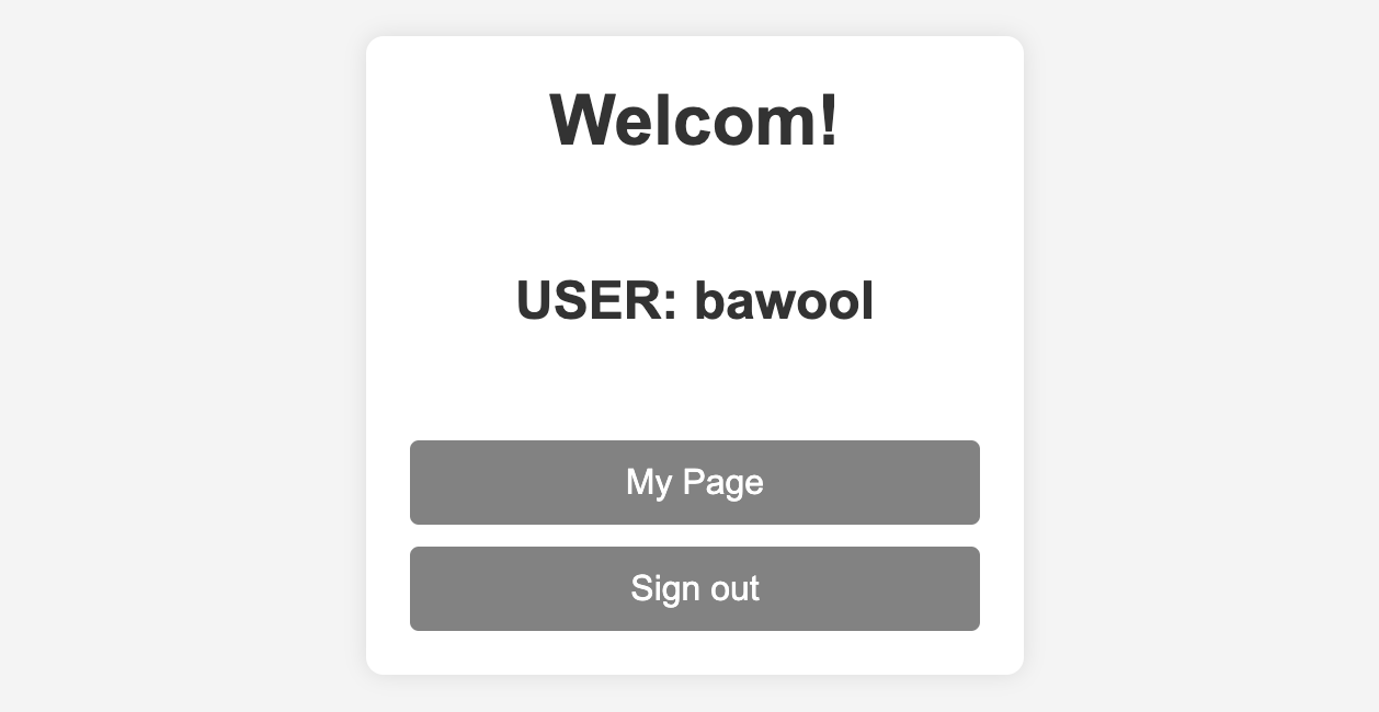 로그인을 하면 자신의 아이디가 출력되고 my page랑 로그아웃을 할 수 있는 버튼이 생기는 페이지로 이동하는 것을 볼 수 있다! 만약 잘못된 정보를 입력하면 어떻게 되는지 확인해 보자