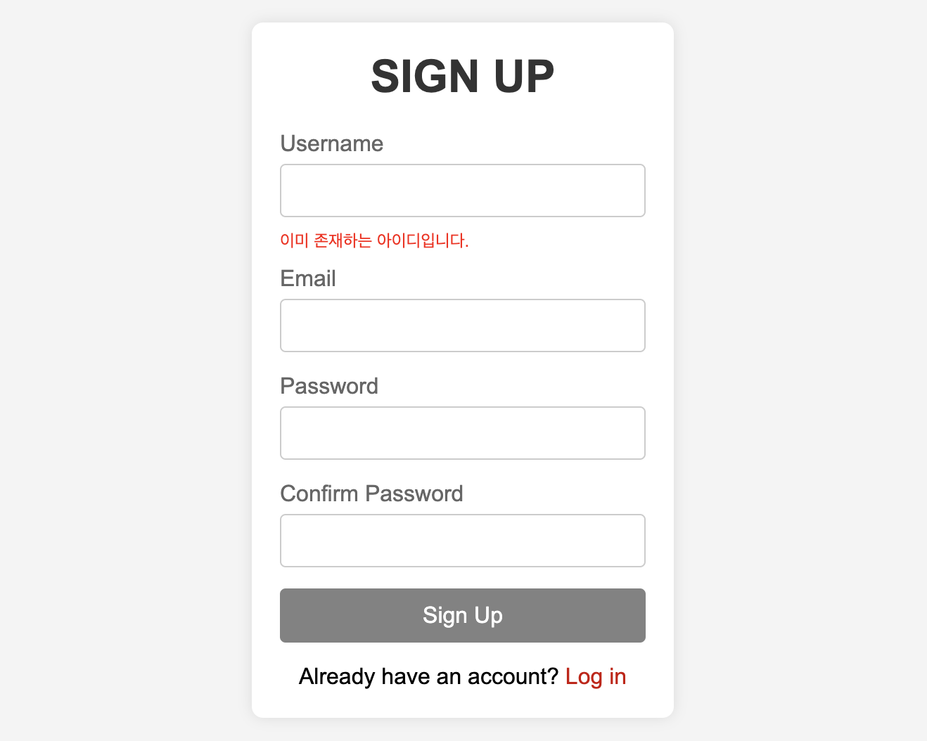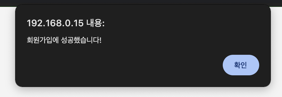 - 회원가입 성공 시 alert를 이용해 성공 메시지와 함께 로그인 페이지로 리다이렉트 되게 해주었다.