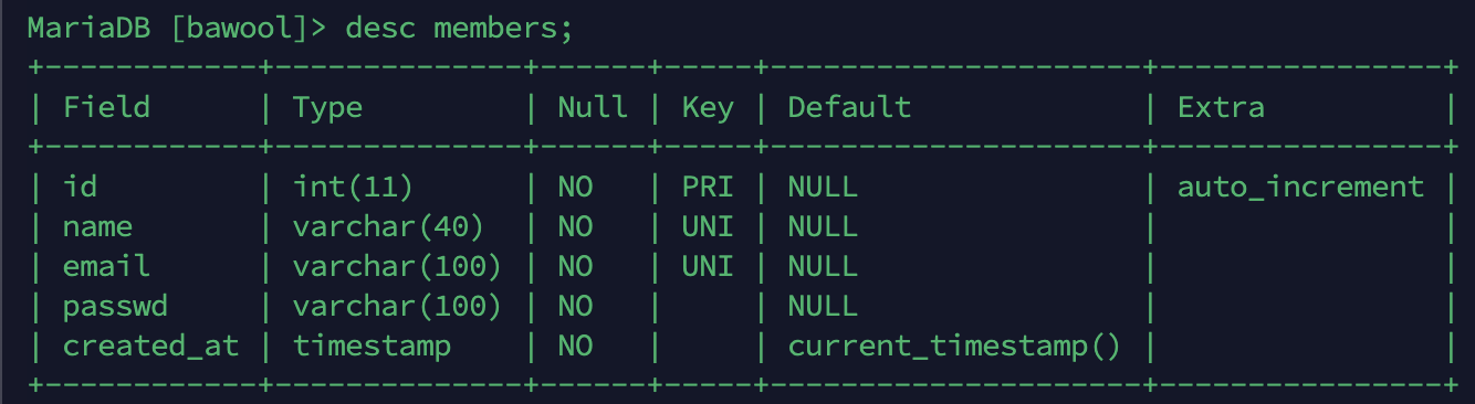 - bawool이라는 DB에 회원정보를 담기 위한 members라는 테이블을 생성해 주었다.