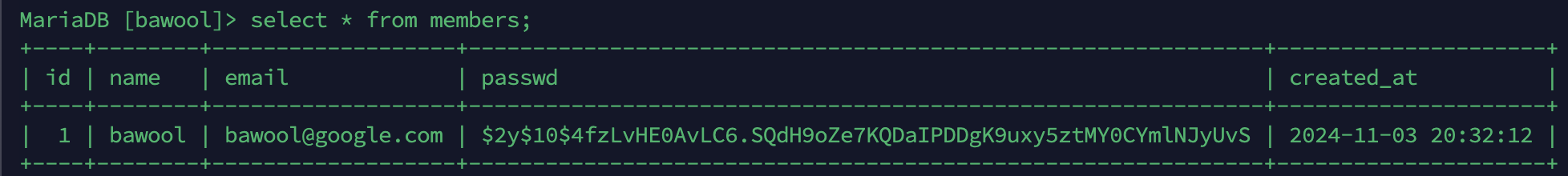 name = bawool, email = bawool@google.com으로 회원가입을 해보았다.