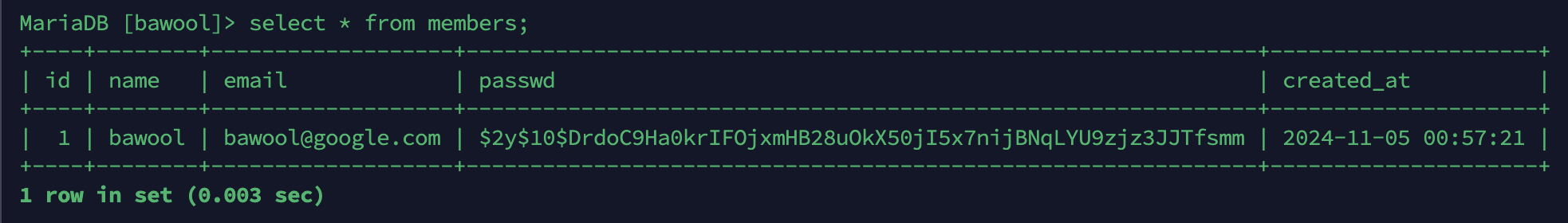 - 사용자 비밀번호를 직접 저장하는 대신, 해시 값을 저장하여 보안을 강화합니다. 사용자가 로그인할 때 입력한 비밀번호를 해시하여 저장된 해시 값과 비교합니다.