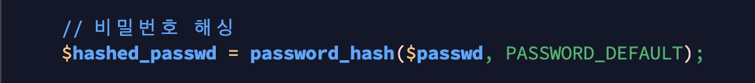 PASSWORD_DEFAULT를 이용 PASSWORD_DEFAULT는 PHP에서 현재 가장 안전한 해시 알고리즘을 자동으로 선택하여 비밀번호를 해시