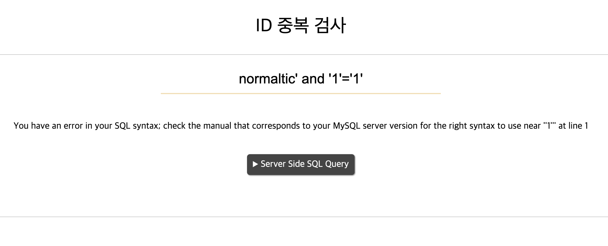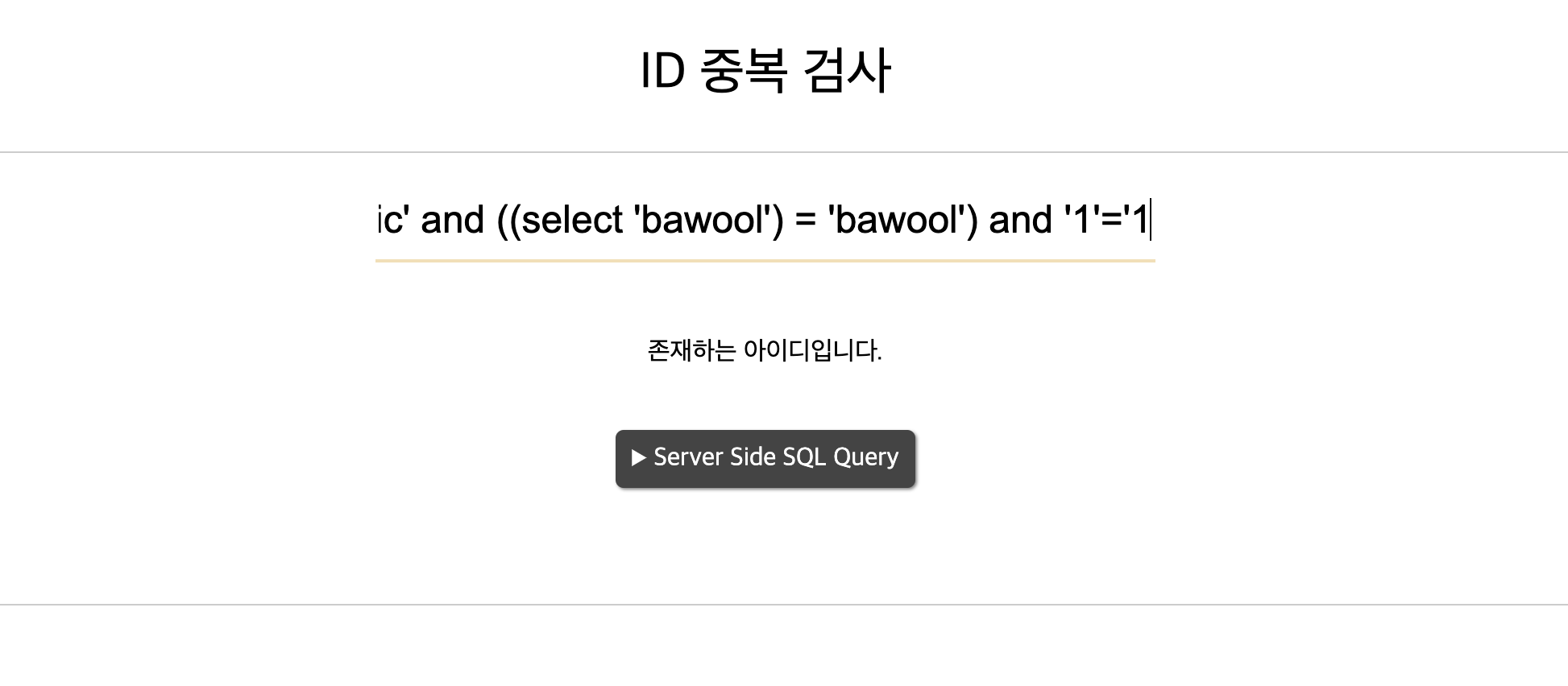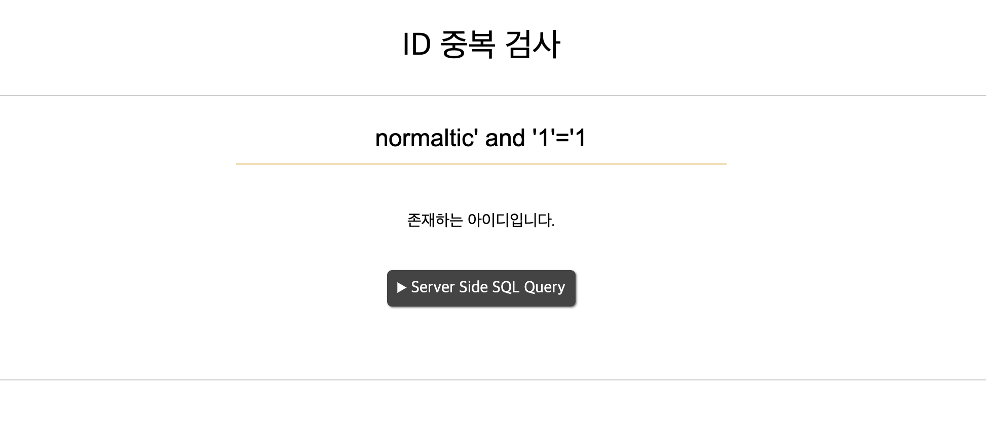 존재하는 아이디일 경우 존재하는 아이디입니다.라는 문구가 나오고 아닐 경우 존재하지 않는 아이디입니다.라고 나오는 사이트이다. 항등원 조건을 사용해 쿼리가 정상적으로 수행되는 걸 알 수 있다.