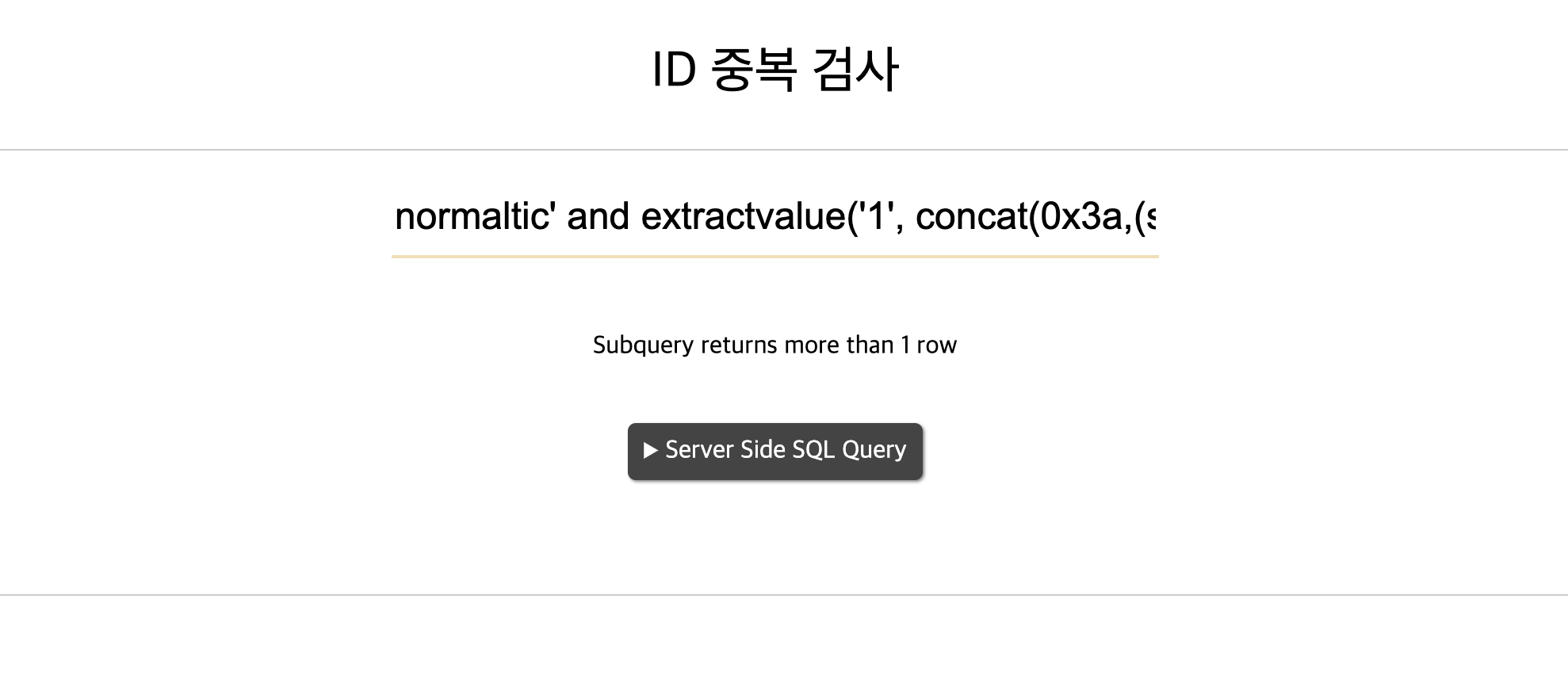 잘못된 문법을 작성 시 syntax 에러가 나오는 것을 볼 수 있다. 하지만 syntax 에러는 결국 실행이 안돼서 우리가 작성한 쿼리를 실행을 못할 것이다. 그러면 우리는 문법은 정확하지만 로직에서 에러를 내서 화면에 출력하는 방법을 찾아야 된다. 그 방법 중에 하나가 extractvalue 함수를 활용하는 것이다. 물론 DB마다 사용하는 함수는 다르다. 해당 사이트가 어떤 종류의 DB를 사용하는지 알아내는 것도 중요하다.