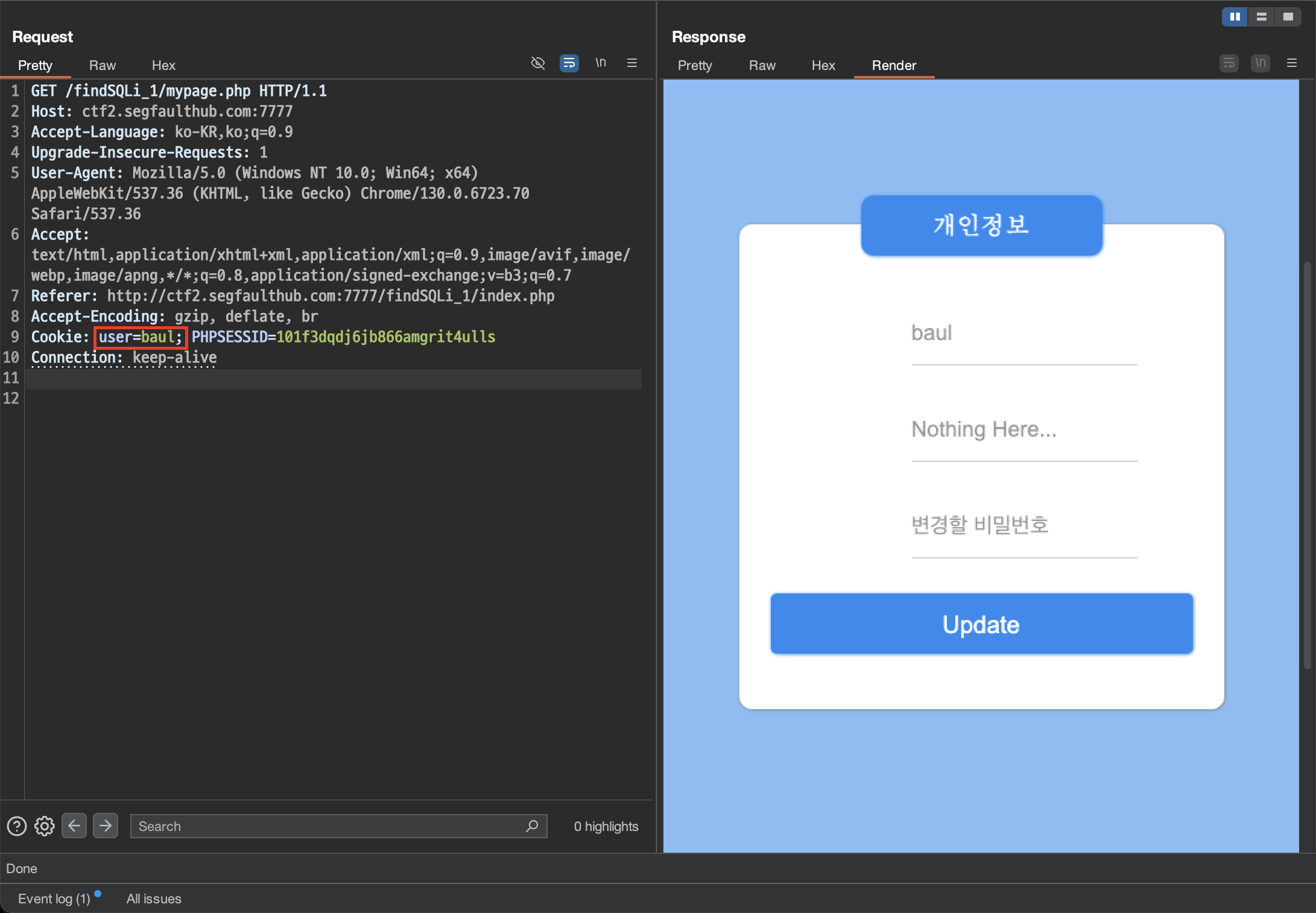 쿠키 값을 확인해 보면 user=baul이라고 되어있는 것을 볼 수 있다. 여기서 알 수 있는 건 사용자 정보를 쿠키 값에 있는 user=이름의 정보를 읽어 마이페이지에 보여주고 있는 거라면 여기에 조건문을 사용해 참과 거짓을 구분할 수 있을 것이다.