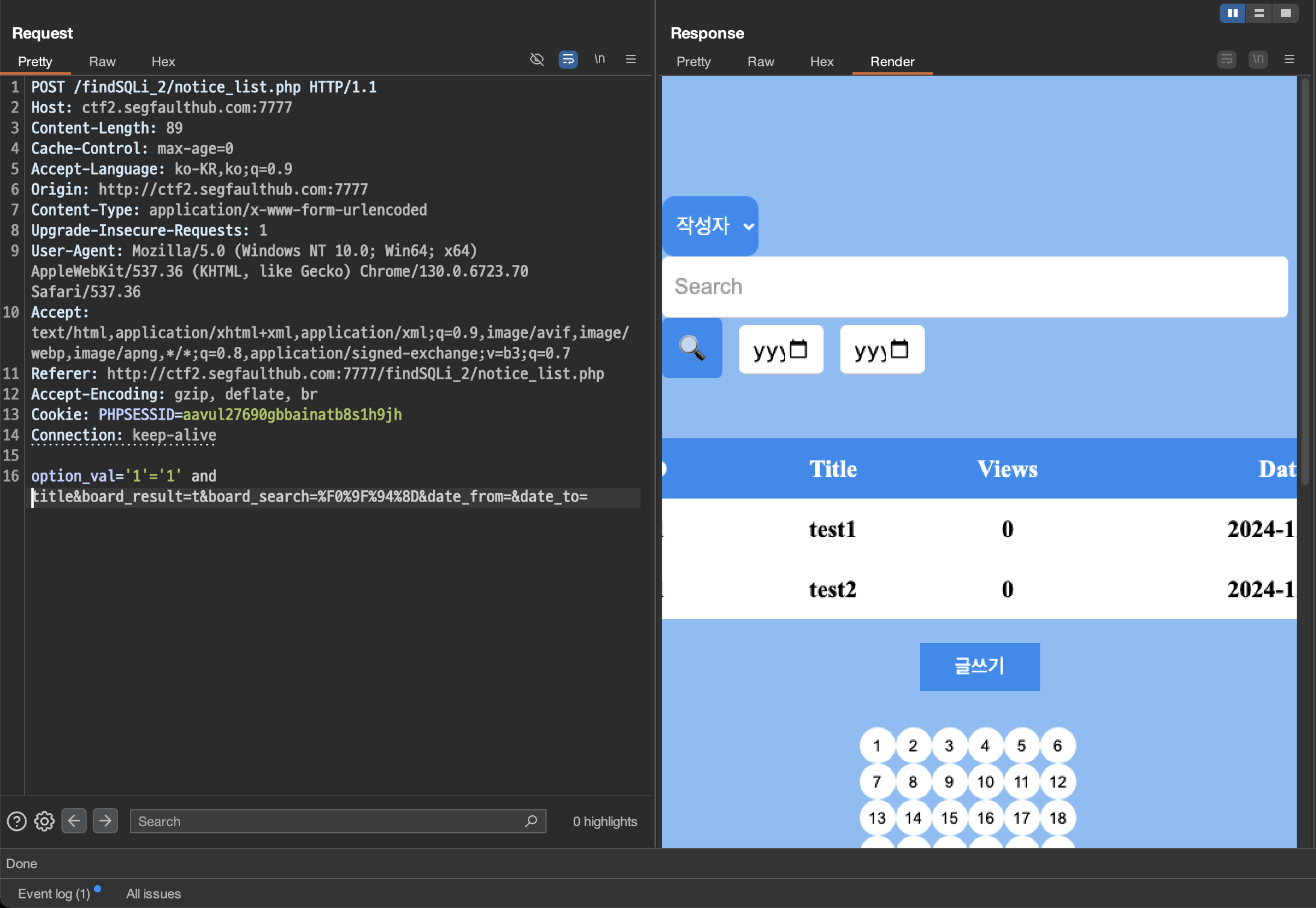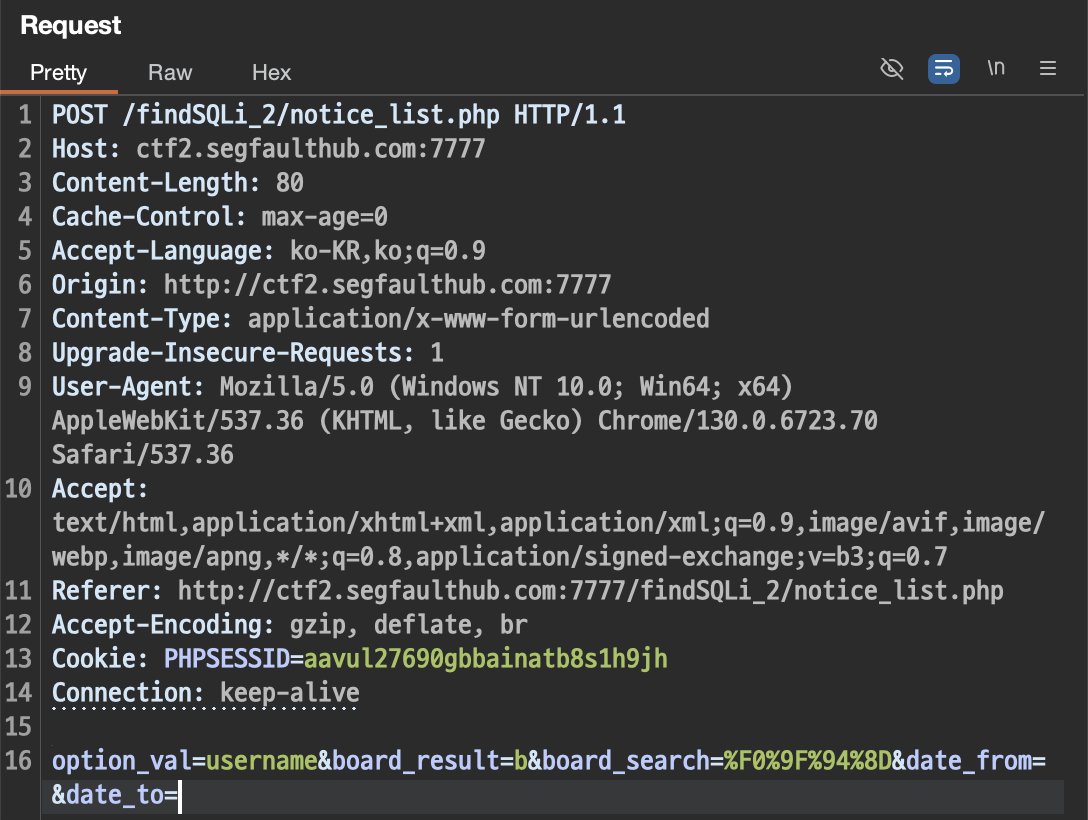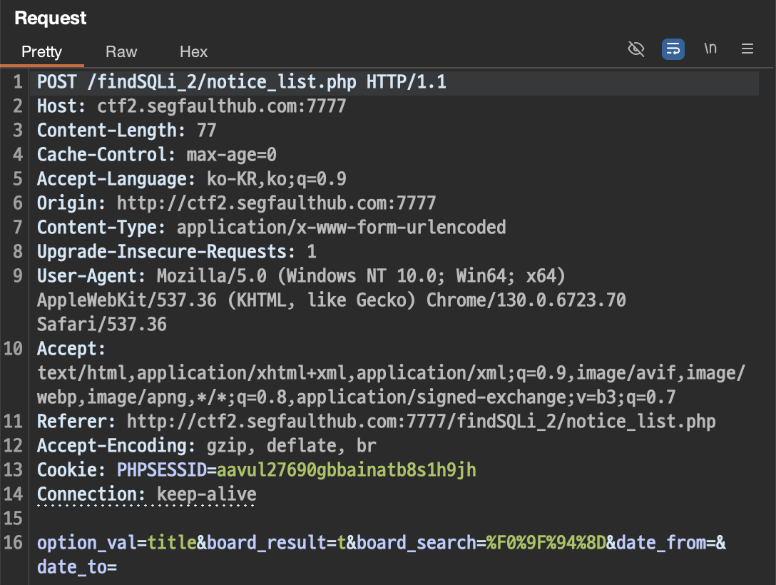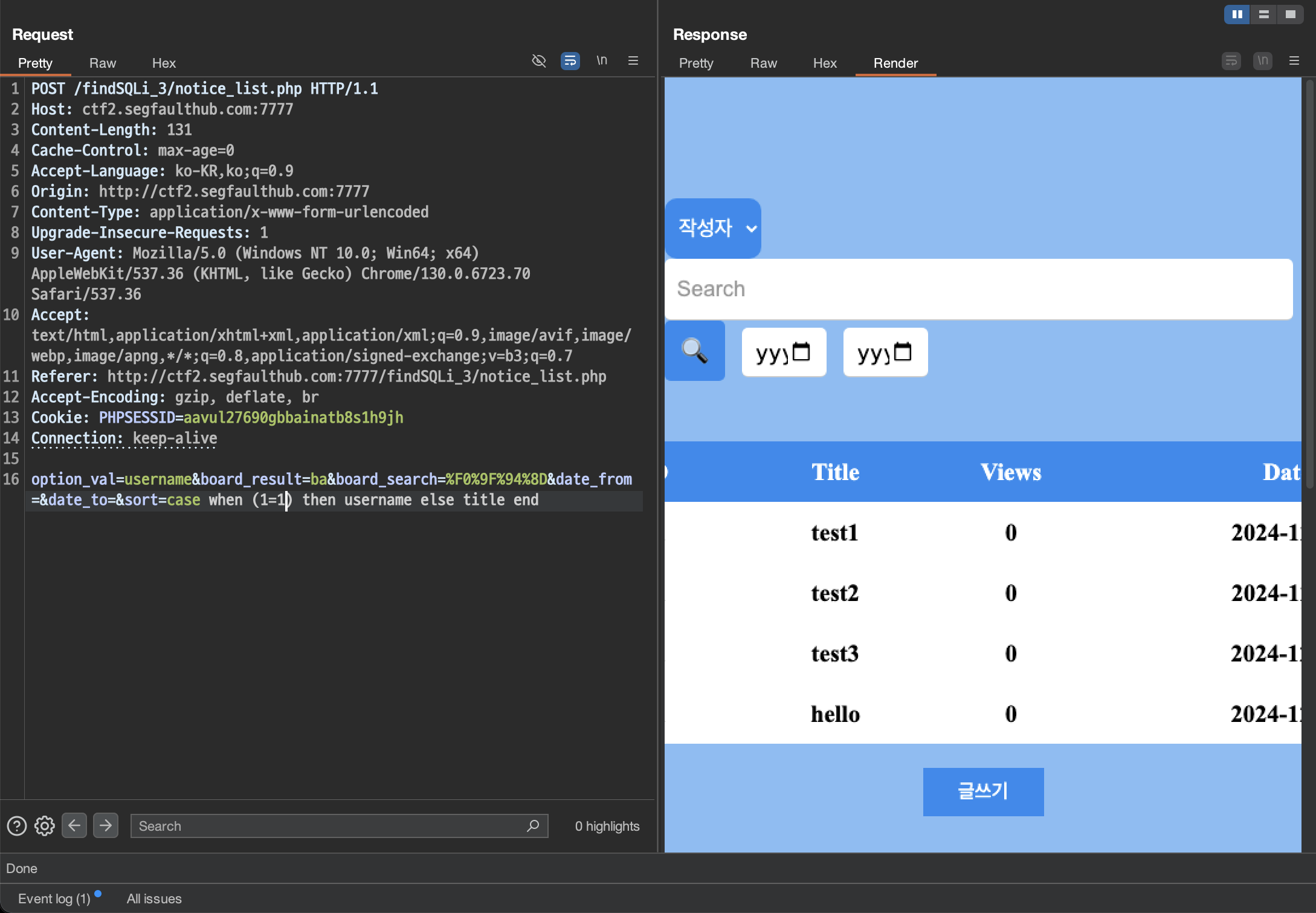 패킷의 파라미터를 살펴보면 option_val=username&board_result=b 내가 입력한 b와 username은 작성자 밑에는 title은 제목 카테고리인 것을 알 수 있다. 이 파라미터가 서버에 전달된다면 제목을 기준으로 내가 입력한 문자를 조건으로 찾기 때문에