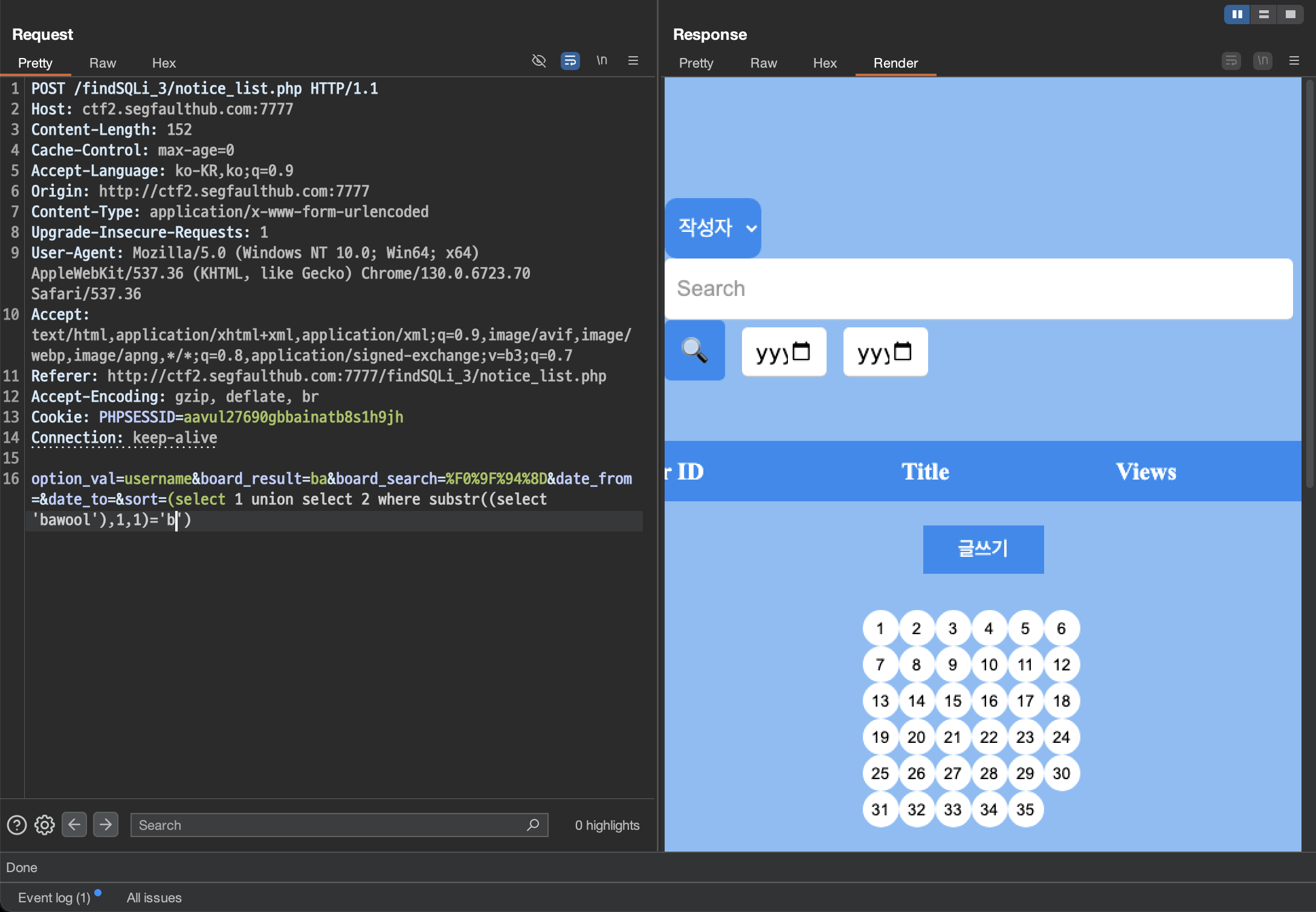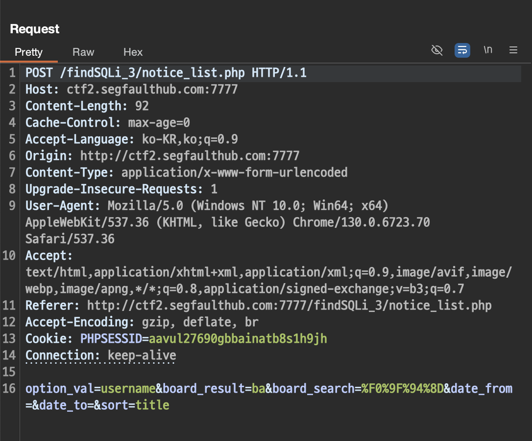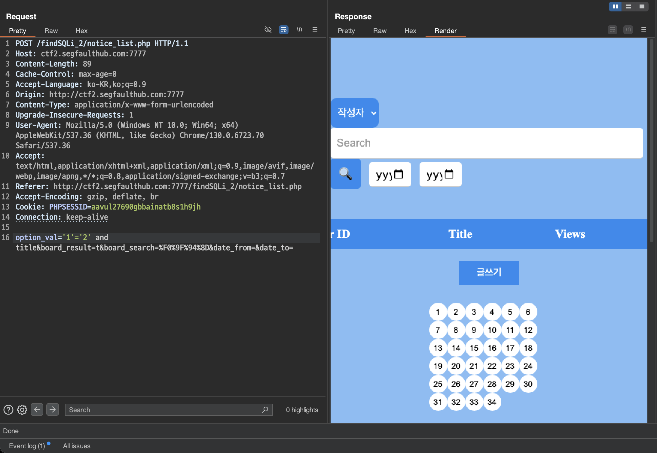 패킷의 파라미터를 살펴보면 option_val=username&board_result=b 내가 입력한 b와 username은 작성자 밑에는 title은 제목 카테고리인 것을 알 수 있다. 이 파라미터가 서버에 전달된다면 제목을 기준으로 내가 입력한 문자를 조건으로 찾기 때문에