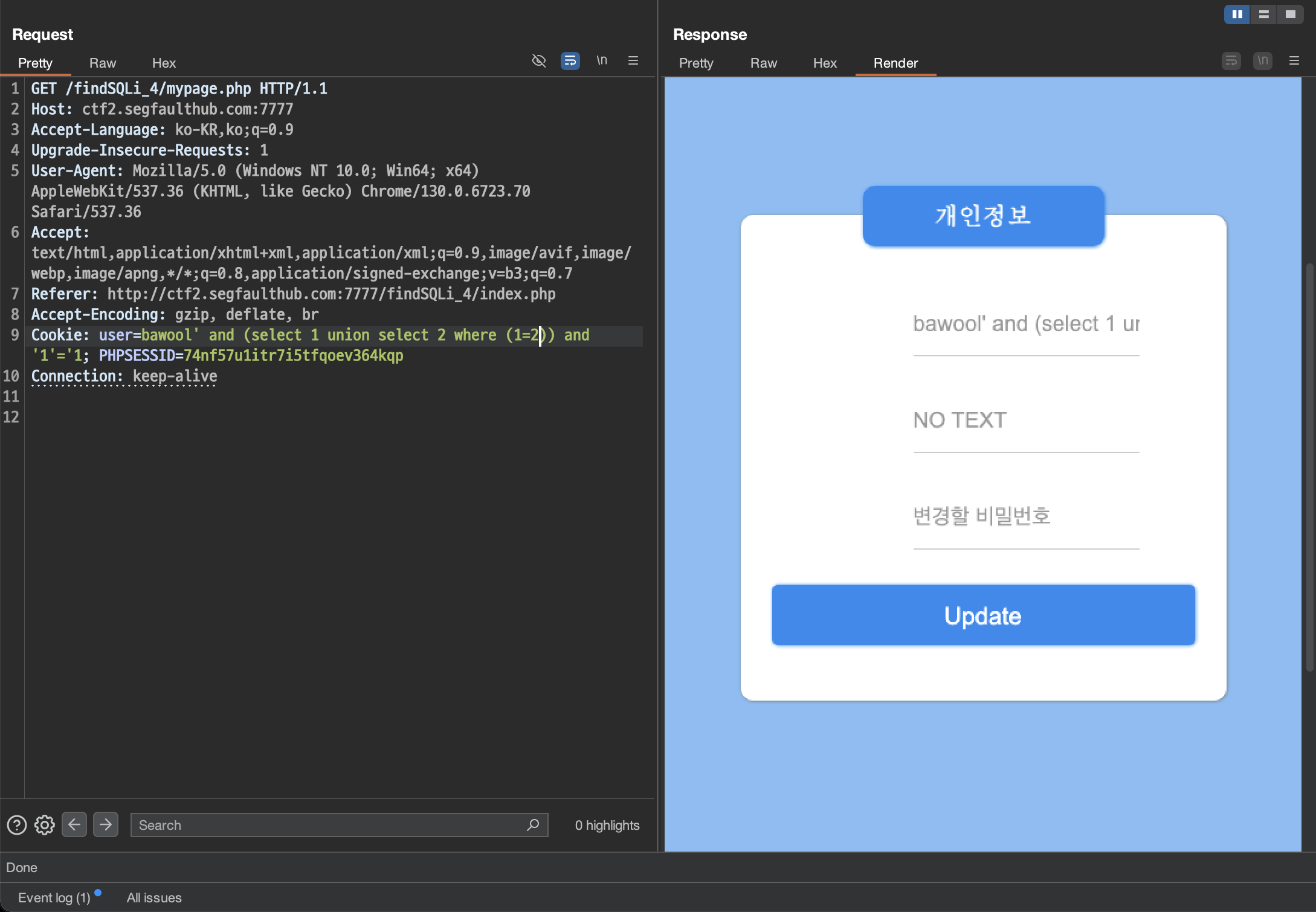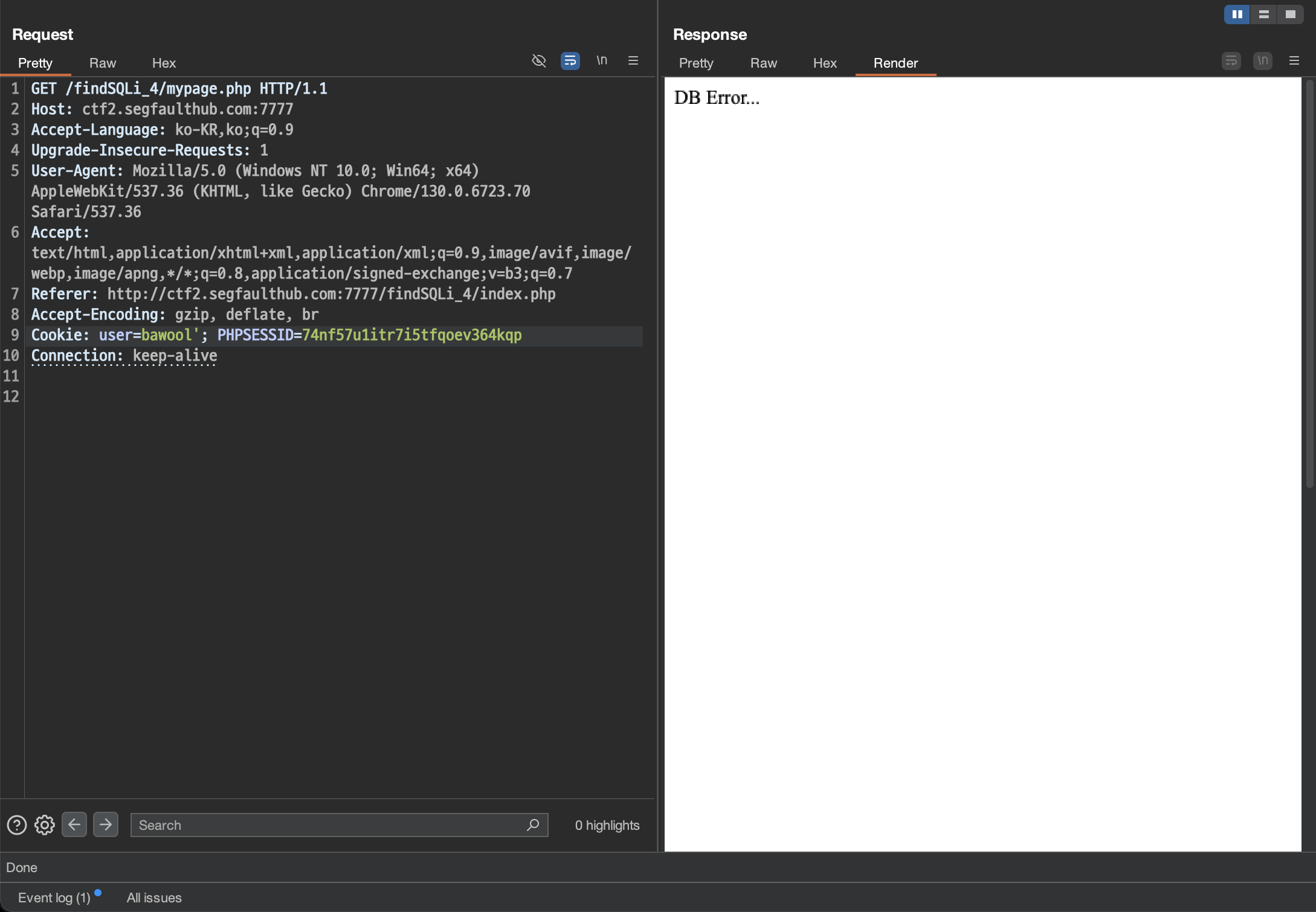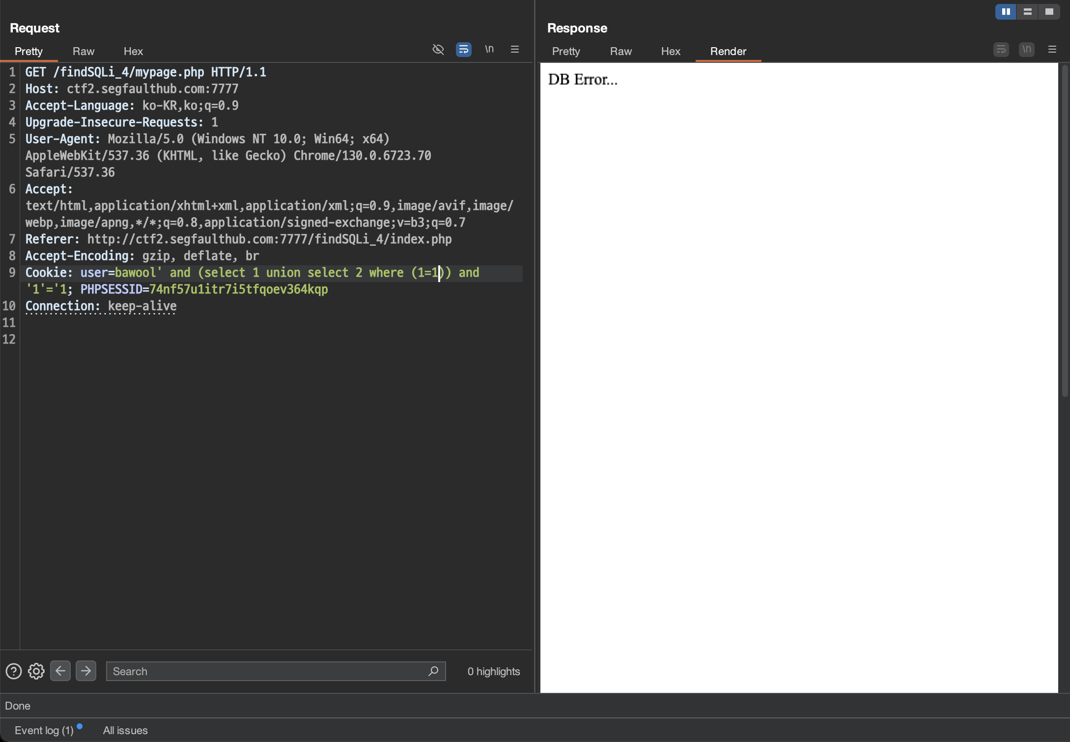 처음과 같이 쿠키 값에 쿼리를 삽입해 보았지만 바뀌는 게 없었다.. 만약 잘못된 문법을 사용하면?