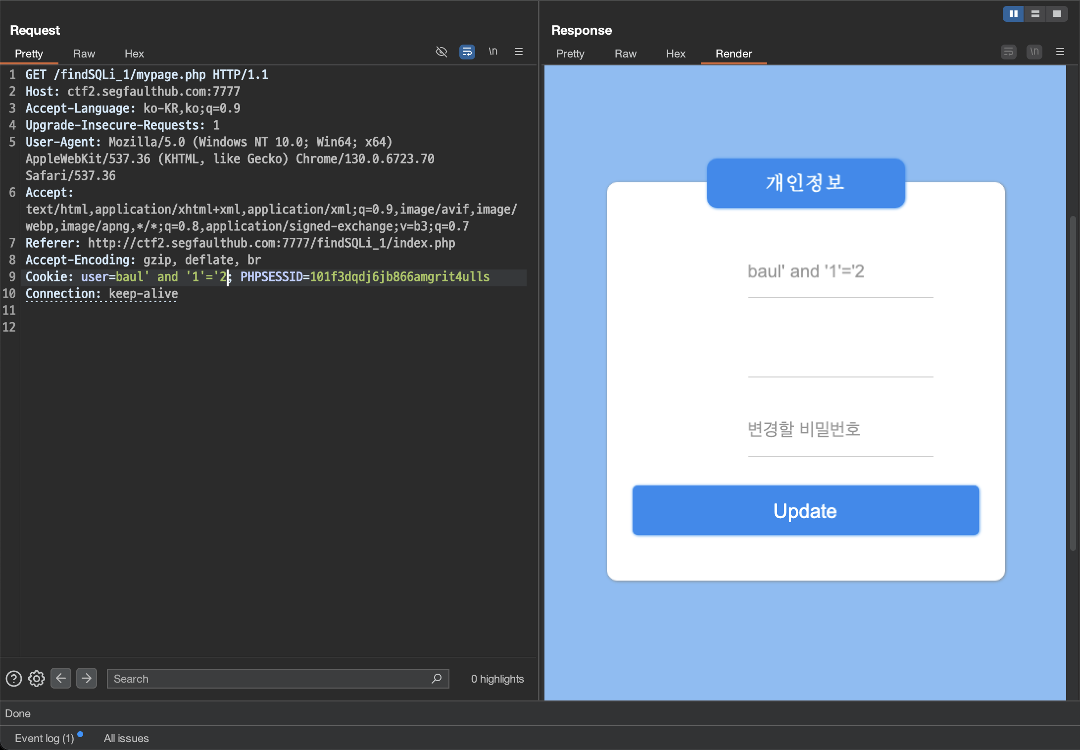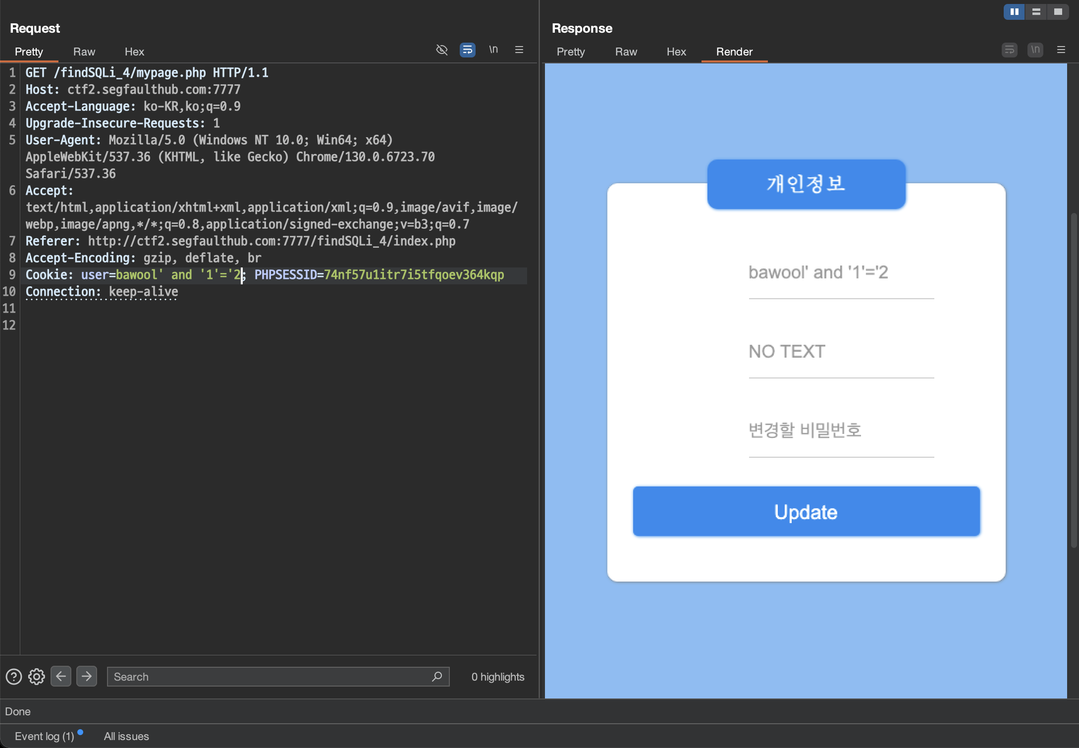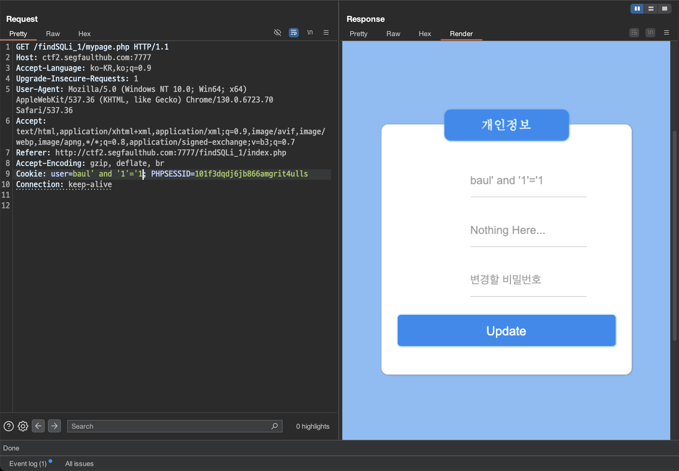서버에서 실행되는 쿼리가 select * from user where user='__' 일 거라고 추측되기 때문에 쿠키 값을 baul' and '1'='1입력해 서버에 전달해 보았더니 이전과 같은 화면이 나온 걸 볼 수 있다. 쿠키에 입력한 값이 그대로 출력되는데..? 그거는 쿠키의 user 값을 그대로 placeholder에 넣고 있는 듯하다. 그럼 참이 아닌 거짓인 조건을 넣는다면 어떻게 될까?