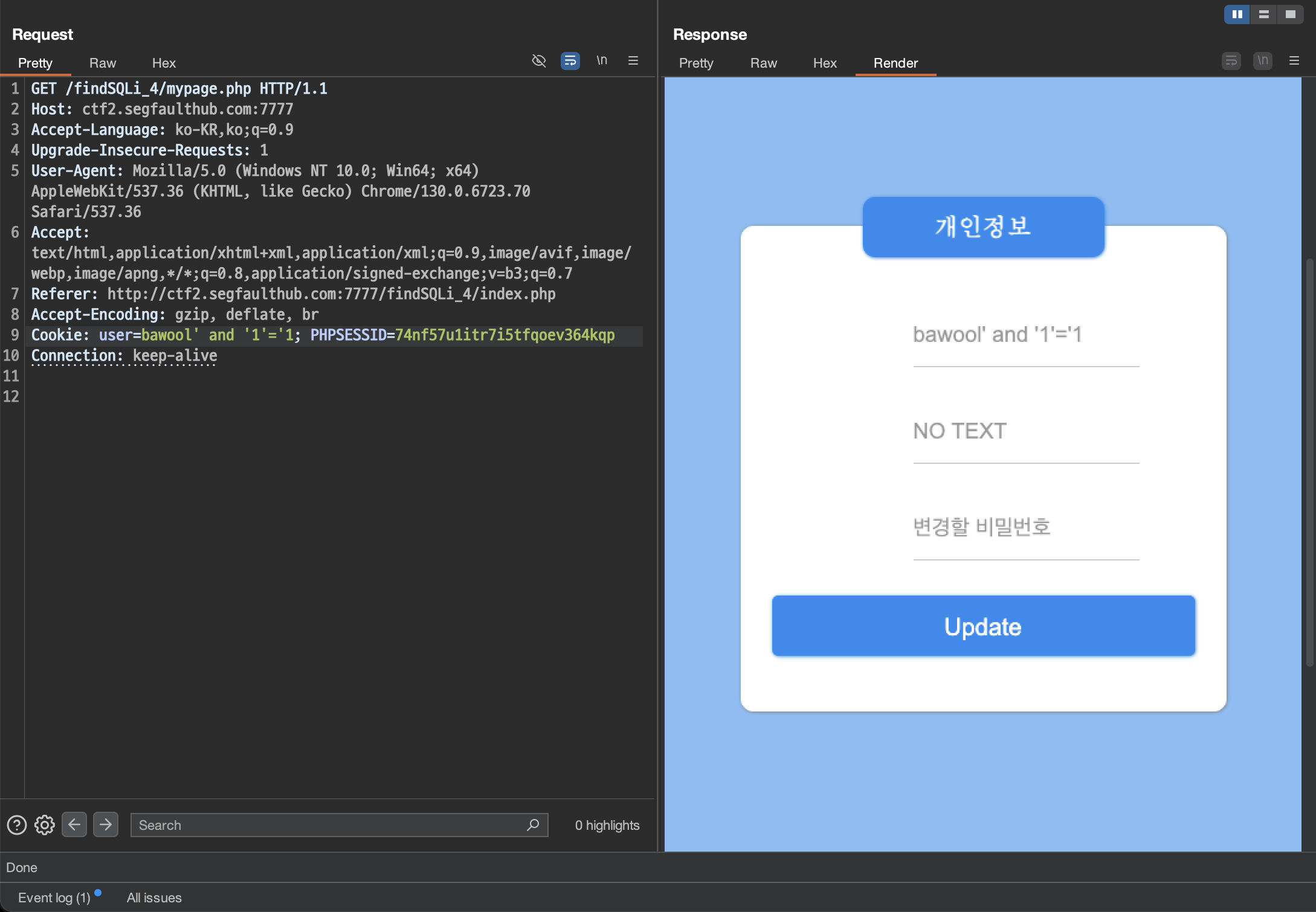 마이페이지로 접근을 하게 되면 사용자 정보가 나오고 update를 할 수 있는 버튼이 있다. 정보를 수정하고 버튼을 누르게 되면 db에게 해당 정보로 update 하라는 요청을 보낼 것이라고 유추할 수 있다. 그럼 사용자 정보는 어떻게 가져오는 것일까? burp suite를 이용해 패킷을 확인해 보자!