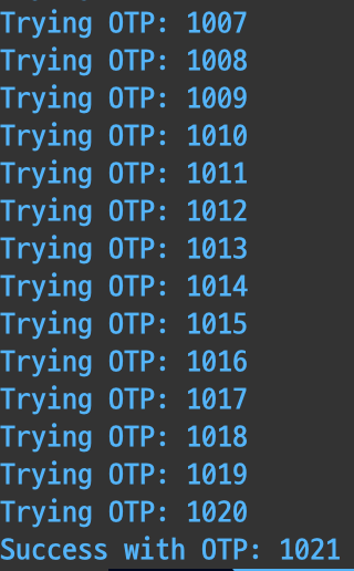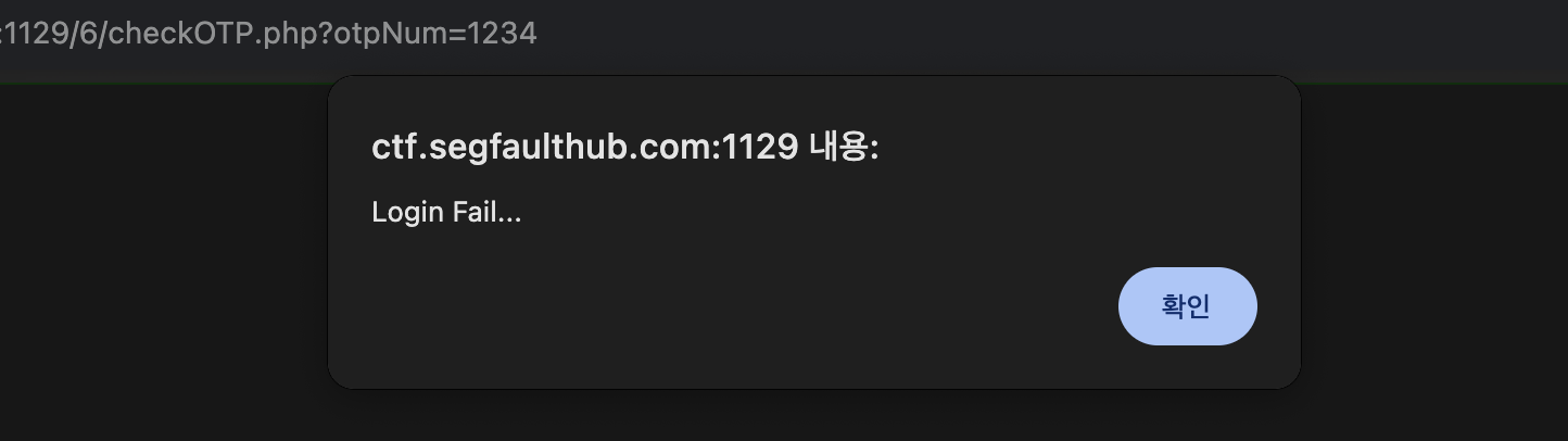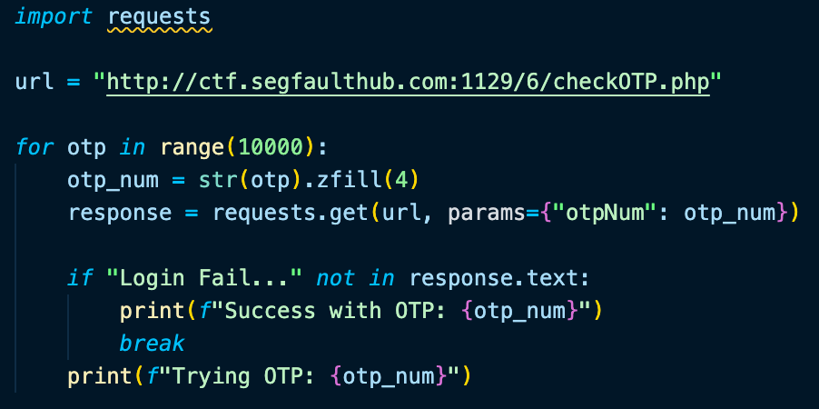 Login Fail...이라는 메시지가 나오고 checkOTP.php?otpNum=으로 입력한 값이 전송되는 걸 알 수 있다. 여러 번 틀린 값을 입력해 본 결과 인증 횟수에는 제한이 없는 게 확인됐다. python requests모듈을 사용해 0부터 9999까지 특정 URL로 값을 전송하는 코드를 만들어 문제를 해결해 보자.