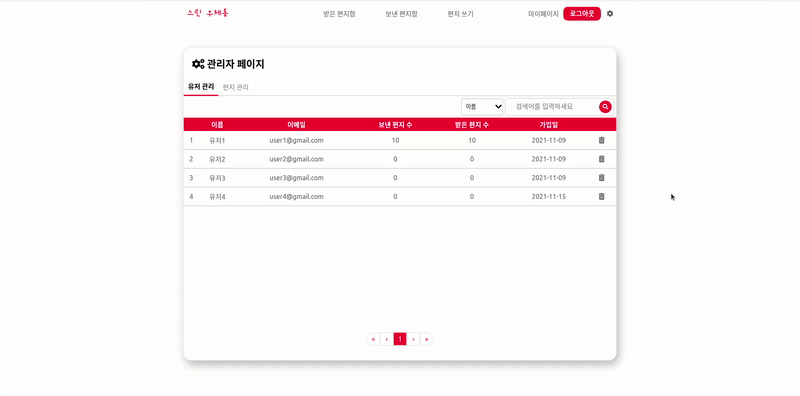관리자 페이지는 프로젝트 시작 전에는 설계하지 않았는데, 코드 스테이츠 측에서 제공하는 요구 조건에 관리자 페이지를 따로 구현해야 해서 기획 단계에서 추가로 맡게 되었다. 데이터 베이스 스키마를 짤 때 필요한 테이블이 2개 뿐이기 때문에 관리자 페이지도 유저 관리와 편지 관리로 나누어서 구현하였다. 이전에 다가치 프로젝트를 진행할때 페이지네이션이나 검색 기능을 구현했기 때문에 목업페이지 제작부터 쉽게 적용할 수 있었다.