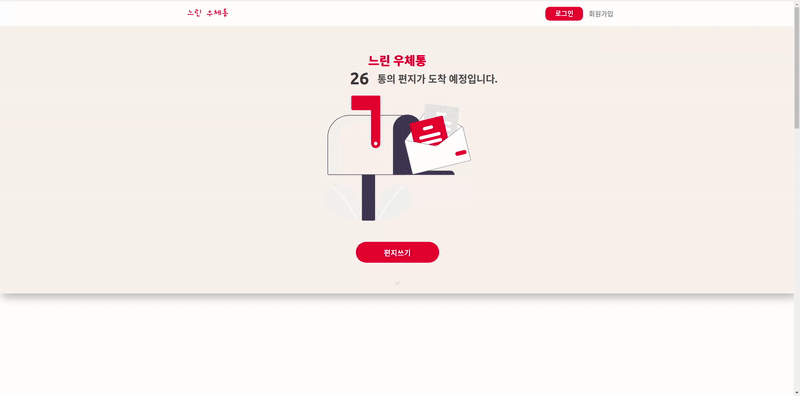 Home 페이지에는 다양한 애니메이션 효과를 적용하고 싶어서 라이브러리들을 찾아서 적용하였다. 느린 우체통이란 사이트의 컨셉에 맞게 도착예정인 편지들의 개수를 카운팅 업 애니메이션을 적용하여 화면에 표시되도록 하였고, 스크롤 애니메이션을 적용하여 서비스에 대한 설명이 표시되도록 하였다. 기능에는 관련이 없는 페이지이지만 페이지를 접속했을때 처음 보이는 화면이기 때문에 서비스에 대한 컨셉과 설명을 담을 수 있도록 구성하려고 하였다.