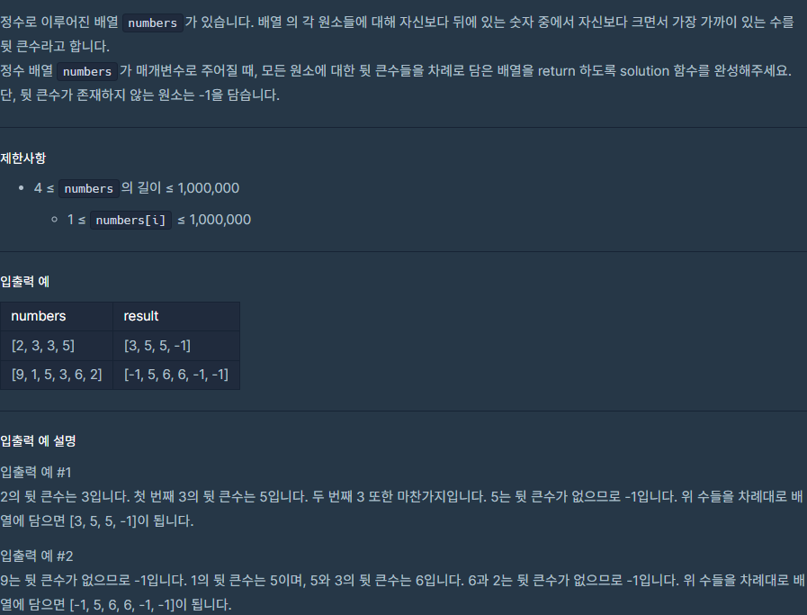 틀린 이유(GPT야 고마워) -> while(numbers[i] > numbers[idx])에서 idx++를 계속 증가시키는데, 만약 끝까지 큰 수가 없다면 ArrayIndexOutOfBoundsException이 발생할 수 있습니다.