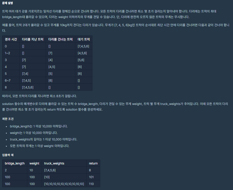 이런식으로 다리 위에 모든 트럭을 통과시키고 걸린 시간을 반환하는 문제이다.
