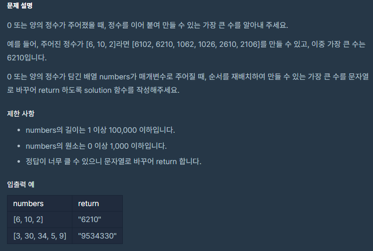 [3, 30, 34, 5, 9] 정렬 -> [9, 5, 34, 3, 30] -> "9534330"