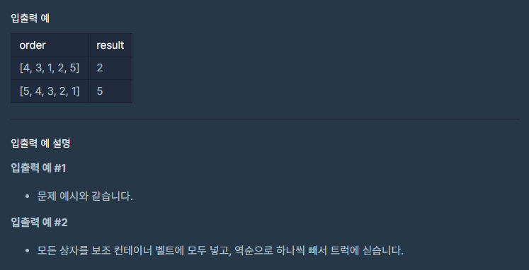 예시 보면서 풀었는데 왜 틀렸쥐,, 생각하면서 연습장에 슥슥 풀어보니 예시2에서 보조 컨테이너 벨트에 상자 실컷 다 쌓아놓고 while문이 끝나버려서 트럭에 싣지 않고 끝나버렸다 띠용!