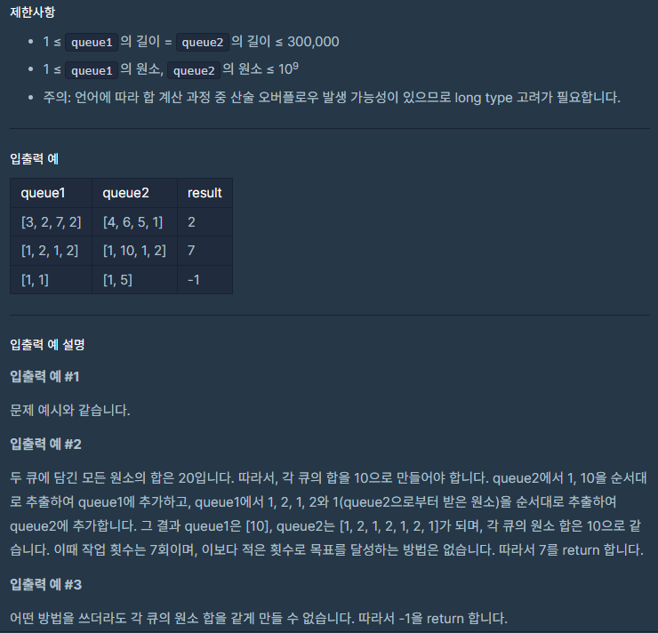 이런식으로 q2에서 1과 10을 빼서 q1에 넣어주고 q1에서는 1,2,1,2,1(이 1은 q2에서 간 친구)를 q2에 넣어준다. 그럼 각 큐의 합은 10(sum/2)이 되기 때문에 그때의 교환 횟수(answer)을 반환해준다.