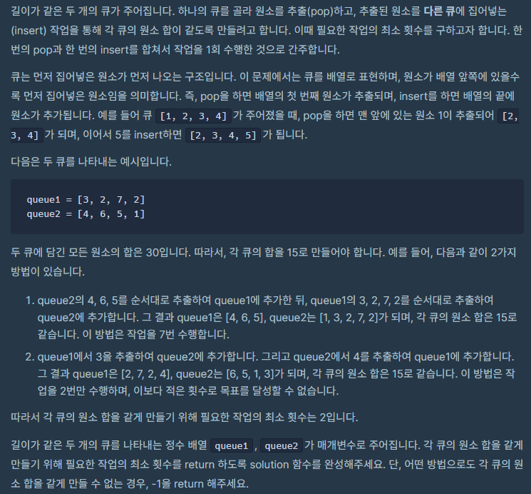 우선 q1과 q2중에 작은 값을 갖고있는 큐에게 큰 값을 갖고 있는 큐의 앞 수를 빼서 넣어준다.