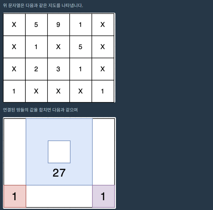 String 배열로 주어졌기 때문에 무인도 하나 당 숫자 or X를 하나씩 넣기 위해 char[][]으로 변환해준다.