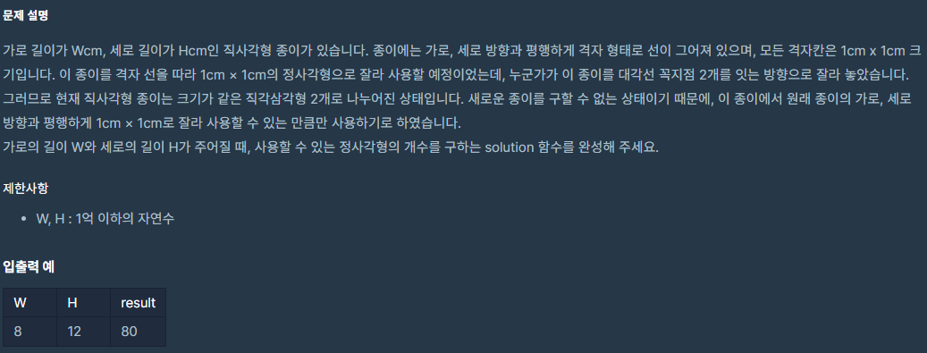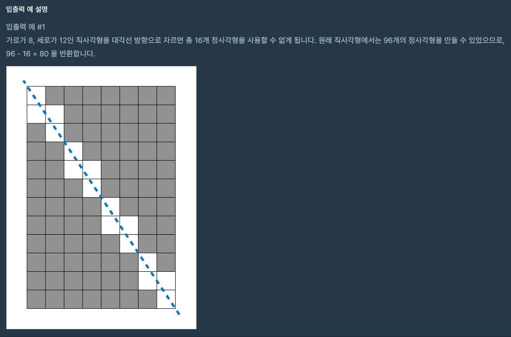 ex) 8*12 직사각형으로 96개의 정사각형을 만들 수 있다. 이때 잘리는 정사각형은 16개이다. 96-16 = 80 반환.