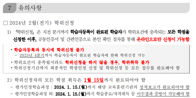 주의 사항으로 4분기까지 학습자 등록이 완료돼야 2월에 학위신청이 가능하다고 하니