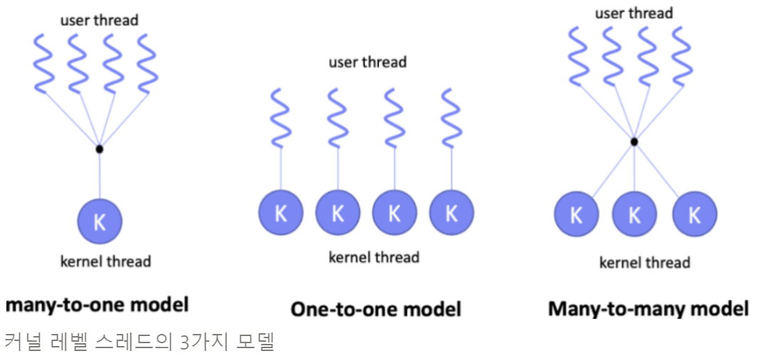 User threads : kernel support 없이 관리 된다. ( ex) Java Thread : O/S가 아닌 JVM이 관리)