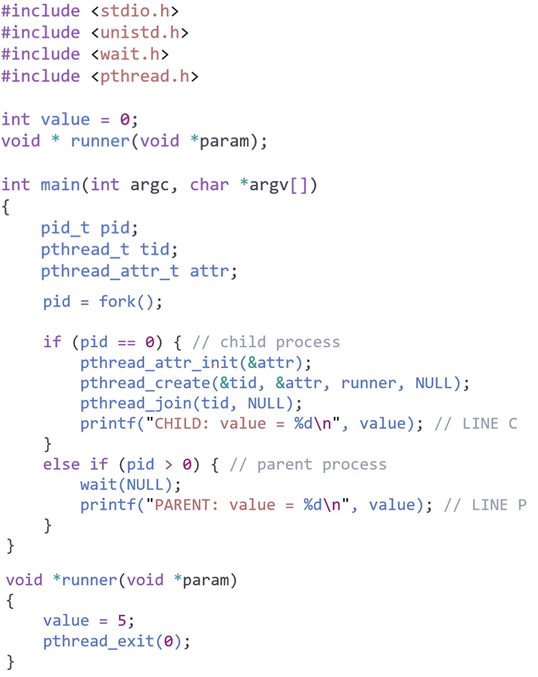 → P3는 thread_create를 통해 쓰레드2를 생성 후, if문 밖의 fork();를 통해 자식 P5를 생성.
