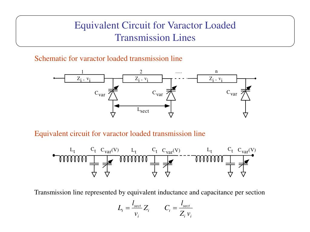 기준 주파수에서 주기 180°의 부하(바랙터)를 주면 균등 전력 분배가 체계적으로 담보되어 입력 정합/분배 문제를 줄일 수 있습니다. 그래서 VLTL의 단위 구간 길이를 기준 주파수에서 λ/2로 잡고, 이 단위 구간은 두 개의 T-section(각 90° 등가 전기길이)을 캐스케이드로 구현합니다.