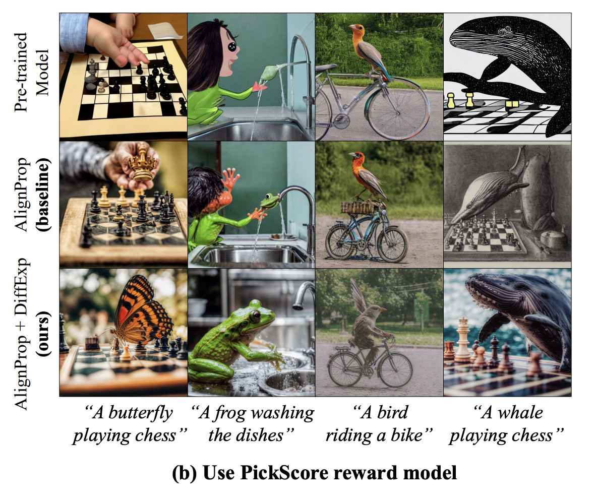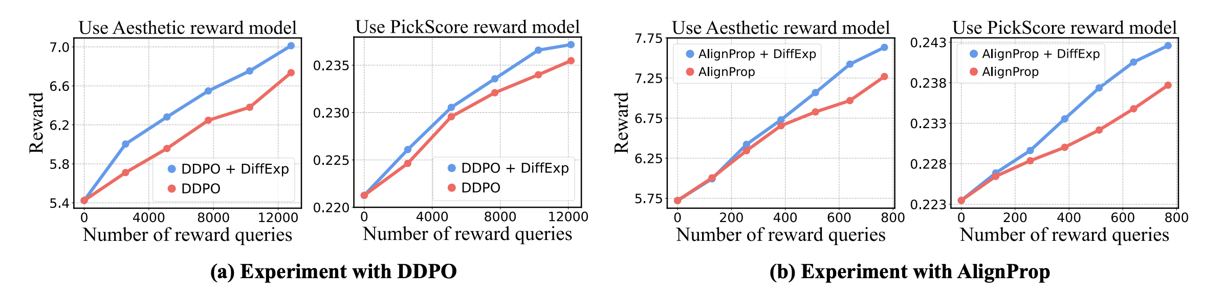 저자들은 대표적인 Reward Fine-tuning 방법론인 DDPO와 AlignProp에 DiffExp를 적용하여 성능을 비교했습니다.