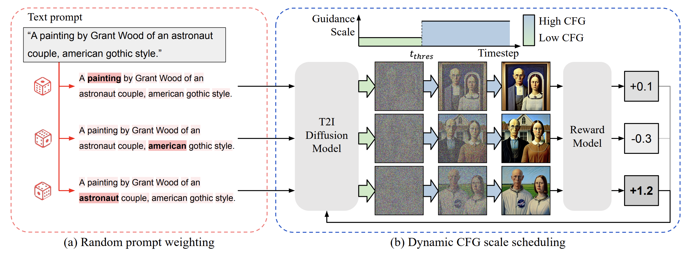 💡 핵심 아이디어: 보통은 이 CFG 값을 고정해두고 쓰는데, 이 논문은 "학습 중에 이 값을 요리조리 바꿔보면 어떨까?"라는 질문에서 시작합니다.