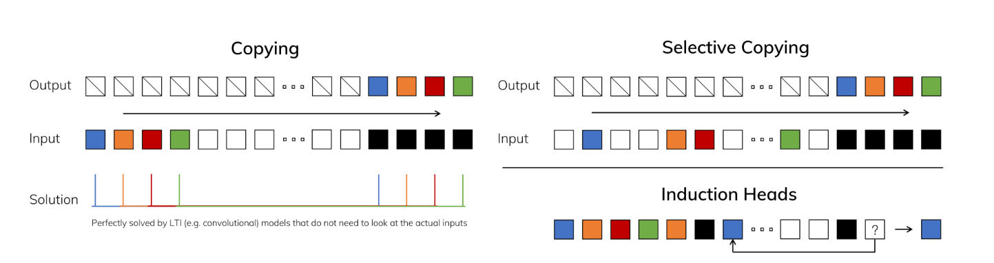 형태의 상태공간 갱신을 수행한다. 여기서 은 앞에서 설명한 것처럼 입력 에 따라 달라지는 선택적(selective) 파라미터이다. 이 덕분에, 어떤 시간 위치/공간 위치의 토큰은 더 강하게, 어떤 토큰은 약하게 상태에 반영되도록 조절할 수 있다.