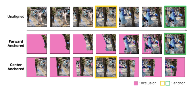 여기서 x는 공간 좌표이고, flow를 통해 “프레임 i에서 앵커 프레임 t로” 픽셀 위치를 맞춰준다. 이렇게 하면 윈도우 안의 모든 프레임이 공간적으로 정렬된 기준 좌표계(앵커 좌표) 위로 모이는 효과가 생긴다.