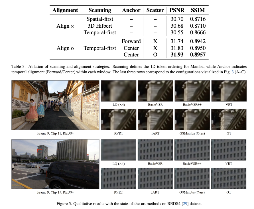 Ablation 실험에서는 세 가지 포인트를 확인한다. 첫째, Mamba를 쓸 때 temporal-first scanning이 spatial-first나 3D Hilbert 스캔보다 VSR에서 더 잘 작동한다는 것을 보인다. 단, 이 경우 반드시 Gather로 정렬을 먼저 해줘야 Mamba가 오동작하지 않는다. 둘째, Scatter를 끄고 anchor 프레임만 업데이트하는 설정과 비교했을 때, Scatter를 켜면 PSNR, SSIM이 추가로 올라가며, 윈도우 안 모든 프레임을 같이 업데이트하는 것이 temporal consistency에 도움이 된다는 점이 확인된다. 셋째, 앵커를 forward(미래 끝 프레임) 대신 center에 놓는 것이 occlusion 감소와 워핑 오차 감소 측면에서 유리하며, 실제로 center-anchored 설정이 항상 더 높은 성능을 낸다는 것도 실험으로 보여준다.