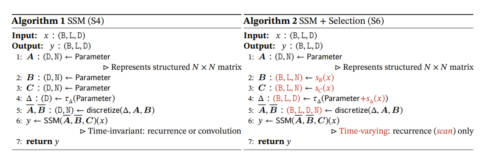 Mamba는 S6방법론을 채택했다. 기존 있던 S4 -> 즉 SSM과 차이점은 파라미터로 존재했던 B,C를 x에 대한 output feature가 N인 선형함수로 치환한다.