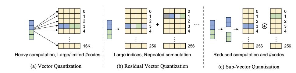 이 방식은 큰 하나의 코드북을 쓰는 것보다 연산 오버헤드가 적고 여러 단계 인덱스를 저장하는 RVQ보다 저장 부담도 줄며 여전히 고정밀 표현을 유지할 수 있다.