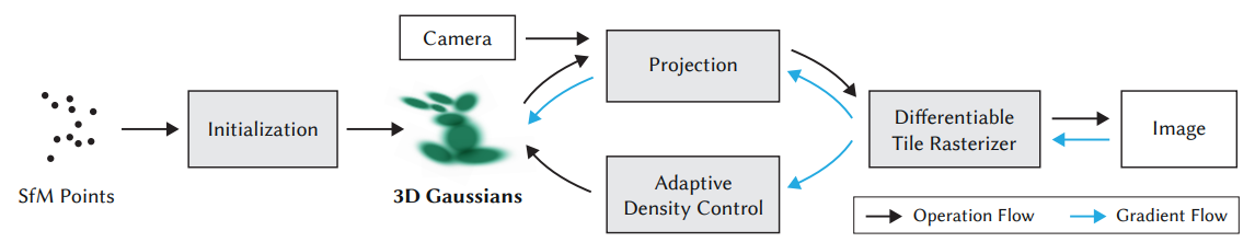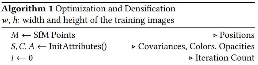 가우시안 스플래팅을 소개하는 논문에서는 수도 코드를 다음과 같이 제시했다.