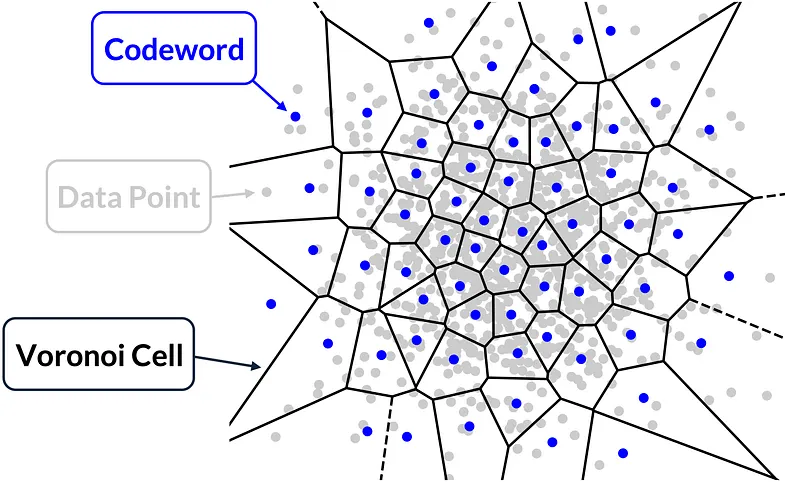 벡터 양자화(Vector Quantization, VQ)는 고차원 벡터를 코드워드(code word) 또는 중심점(centroid)이라 불리는 제한된 대표 지점 집합에 매핑하여 데이터를 압축한다. VQ는 데이터의 기능을 유지하면서 크기를 최소화하여 더 쉽고 효율적으로 처리 및 저장할 수 있게 한다. 이 방식은 이미지 압축, 오디오 처리, 머신러닝, 근사 최근접 탐색(ANN search)에 이상적이다.