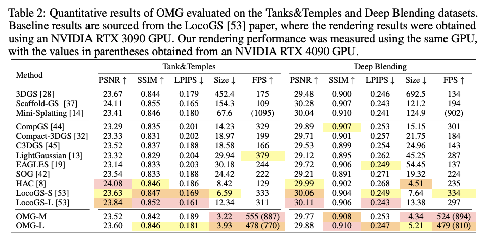속도 측면에서도 이득이 크다. 고성능 GPU 기준으로 OMG-XS는 수백 FPS, 최대 600FPS 이상의 렌더링 속도를 달성하면서, LocoGS보다 더 빠른 경우가 많다. 학습 시간도 Mini-Splatting과 비슷한 수준이라, 별도로 큰 학습 비용을 치르지 않고도 압축과 속도 개선을 동시에 얻는 구조라고 볼 수 있다.
